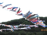 ムサシさんが相模川上流をウォーキング。折から1200匹の鯉のぼりが高田橋の上空を泳いでいたそうです。 |