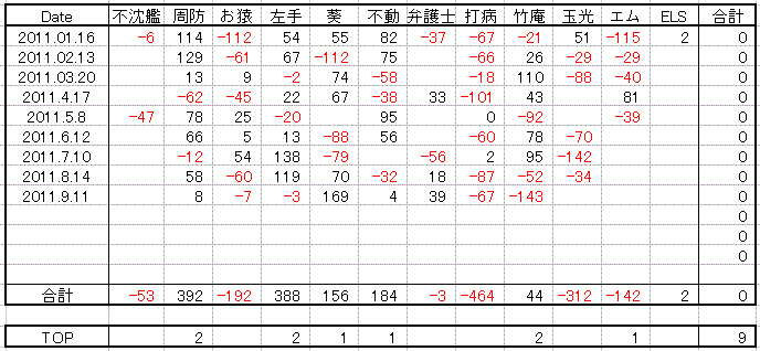 2011.10より、クラブ内の麻雀同好会で、月例で楽しんできた大会の 結果が報告されなくなりました。せっかく、テニス以外の楽しいクラブライフの 一環をお伝えしていたのに、今後は出来なくなりました。 悪しからず、ご了承ください。 テニス仲間11人で月例の頭と手先の運動をやっています。 浮き沈みの激しいは浮世の常、激戦の後は赤提灯で傷を舐めあっています。 戦績: 2011年月例雀鬼戦結果